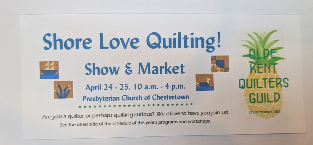 The Olde Kent Quilters Guild will have their Raffle Quilt on display in the lobby. Stop by to purchase a ticket for a chance to win this outstanding quilt. Their annual Show and Market is coming up April 24-25 from 10 am – 4 pm at the Presbyterian Church of Chestertown.